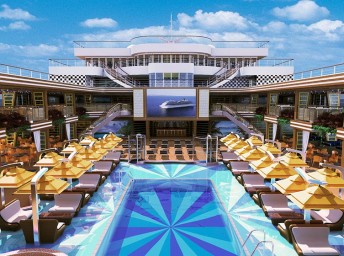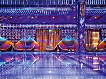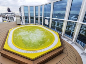 - otevřený bazén na horní palubě, 1 bazén s posuvnou prosklenou střechou, bazén pro děti s vodním miniparkem