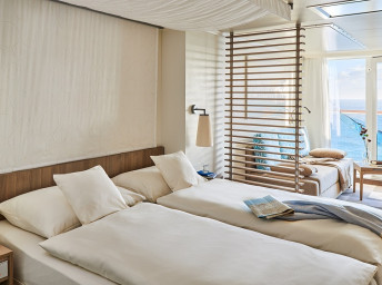 Ve všech kajutách se nachází koupelna se sprchou, 2 pevná lůžka a v některých kajutách též 2 přistýlky ve formě sklopných lůžek či rozkládacího sofa, úložné prostory, trezor, vysoušeč vlasů, telefon, TV, regulovatelná klimatizace.