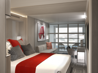 Základní vybavení všech kajut: koupelna s WC, fén, toaletní potřeby; lůžka, dostatek úložných prostor, toaletka se zrcadlem, individuálně nastavitelná klimatizace, TV, župany, trezor, minibar.