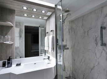 Základní vybavení všech kajut: koupelna s WC, fén, toaletní potřeby; lůžka, dostatek úložných prostor, toaletka se zrcadlem, individuálně nastavitelná klimatizace, TV, župany, trezor, minibar.