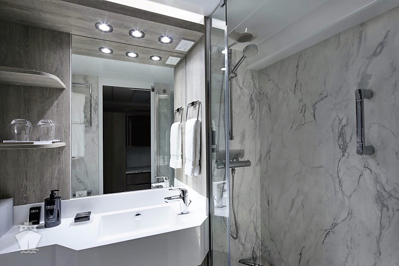 Základní vybavení všech kajut: koupelna s WC, fén, toaletní potřeby; lůžka, dostatek úložných prostor, toaletka se zrcadlem, individuálně nastavitelná klimatizace, TV, župany, trezor, minibar.