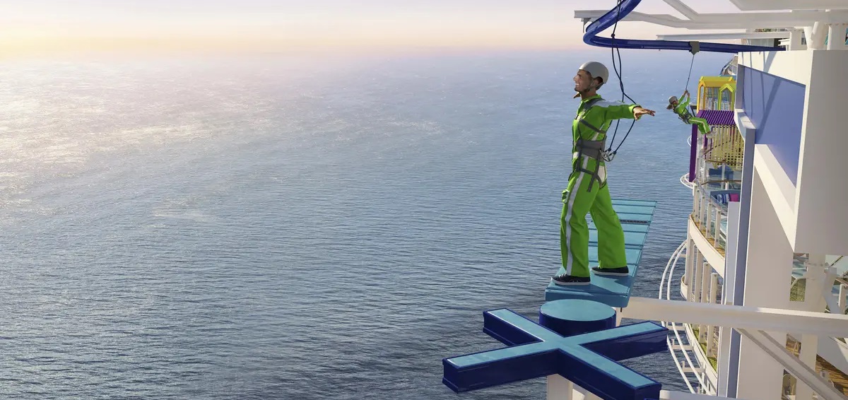Nová atrakce Crown's Edge kombinuje prosklenou visutou stezku skywalk, lanovou dráhu a vzrušující jízdu v jednom. Nejprve vás zavede na lanovou dráhu vysoko nad oceánem, kterou překonáte balancováním na různých tvarech a chodnících. Zní to jednoduše? Tady je háček: kráčíte po vnějším obvodu lodi a pod vámi je jen oceán. A pokud ani to není pro vás dost vzrušující, stezka se náhle ztratí a vy najednou zjistíte, že se houpete 47 m nad oceánem.