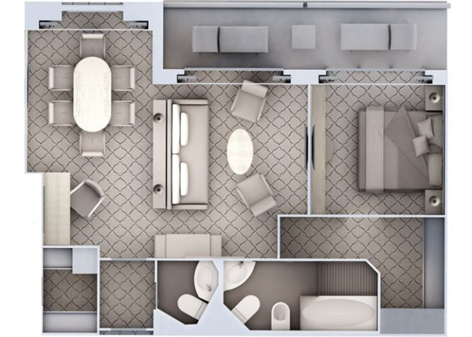| R1 - Royal Suite 1 69 m² (včetně balkona). Obývacia časť s jedálňou, oddělená ložnice. | 2 125 520 Kč 2 125 520 Kč za osobu | ||