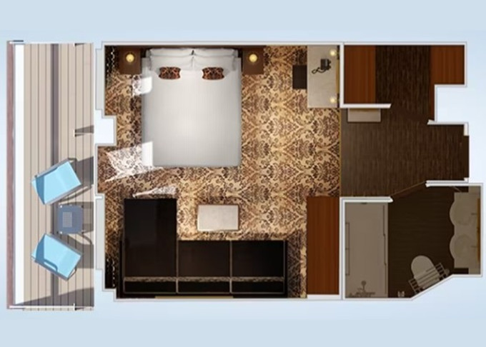 | 7C - Kajuta s balkónem Cca 21 m² ( kajuta i balkón); balkon je částečně chráněný - "cove". | 51 985 Kč 25 993 Kč za osobu | ||
