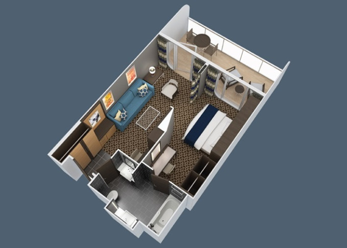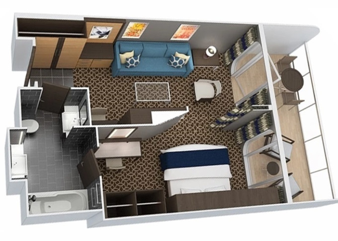 | 1U - Vnitřní kajuta s virtuálním balkonem 15 m². Obrazovka velkosti balkonových dverí s promítaným výhledem. 8. až 11. paluba. Max 2-4 osoby. | 101 522 Kč 25 381 Kč za osobu |