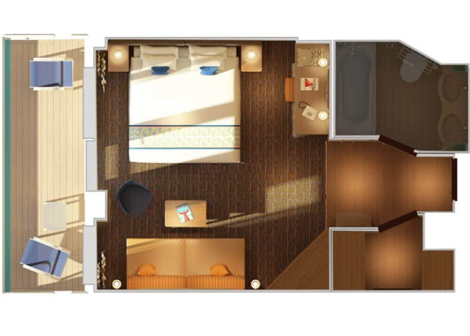 | OS - Ocean Suite 100 - 108 m² (kajuta a balkón). 2 koupelny, vířivka, šatník. Služby Suite. | 122 769 Kč 61 384 Kč za osobu | ||