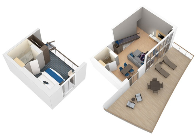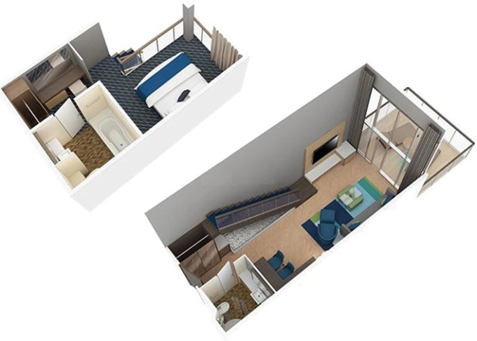 | L1 - Crown Loft Suite s balkonem 50 m² / balkon 10,5 m². 2-podlažní apartmán. Výhody Royal Suite Class. 17. paluba. Max 4 osoby. | 257 914 Kč 128 957 Kč za osobu |