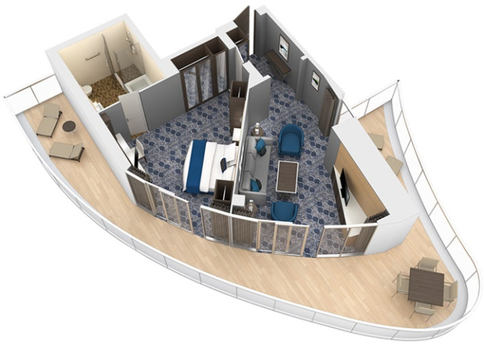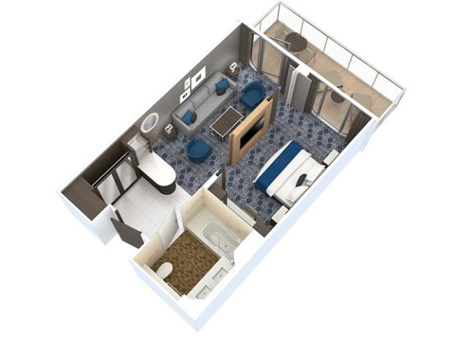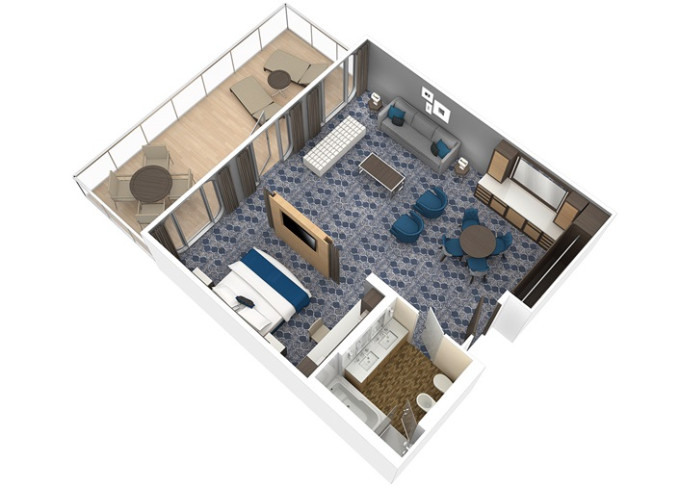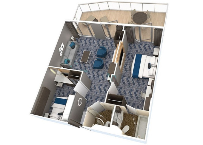 | J3 - Junior Suite s balkonem 26,5 m² / balkon 7,5 m². Výhody Royal Suite Class. 6/7/8/14. paluba. Max 5 osob. | 194 150 Kč 194 150 Kč za osobu |