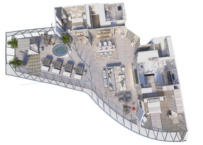 | EV - Edge Villa s balkonem 69 m² + terasa s vířivkou 20 m². 2podlažní apartmán. Max 4 osoby. 15/16. paluba. Výhody Suite. | 1 207 140 Kč 402 380 Kč za osobu |