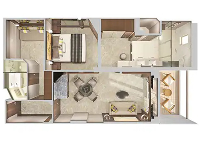 Suite: luxusní varianta ubytování na nejlepších místech na lodi, prostorné a luxusně vybavené; více variant včetně suite v privátní zóně The Haven