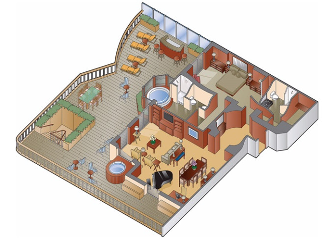 | PS - Penthouse Suite 133 m² + balkon s vířivkou 102 m² . Koupelna s vířivkou. 6. paluba. Max 3 osoby. Výhody Suite. | 1 196 717 Kč 299 179 Kč za osobu | ||
