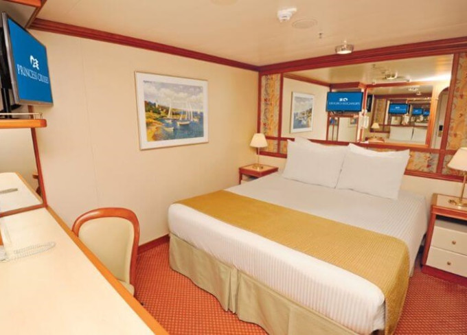 Standardní vybavení kajut: koupelna se sprchou a toaletou, 2 lůžka s možností konfigurace, úložné prostory, minibar, fén, TV.