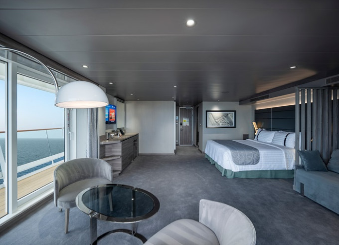 Kajuty Infinite - VL1, VL2 - s panoramatickým oknem; některé kajuty jsou s oknem, které se po otevření změní na skleněnou balustrádu.