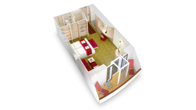Ve všech kajutách se nachází koupelna se sprchou, 2 pevná lůžka a v některých kajutách též 2 přistýlky ve formě sklopných lůžek či rozkládacího sofa, úložné prostory, trezor, vysoušeč vlasů, telefon, TV, regulovatelná klimatizace.