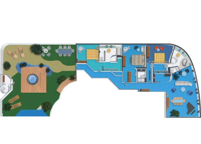 | S1 - Garden Villa - 3 ložnice 622 m² / balkon 414 m². Vířivka. Výhody Suite. 14. paluba - střed. Max 7 osob. | 1 176 756 Kč 588 378 Kč za osobu | ||