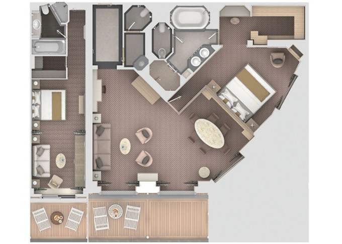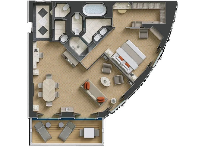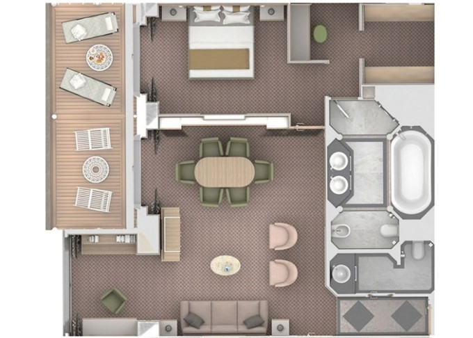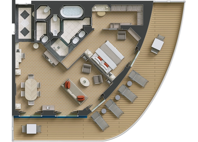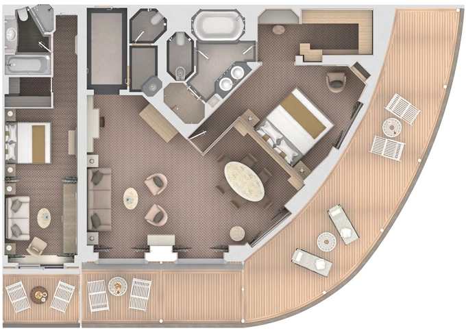 | O1 - Owner's Suite 1 88 - 98 m² (včetně balkonu). Ložnice, oddělená obývací a jídelní část. | 1 247 729 Kč 415 910 Kč za osobu | ||