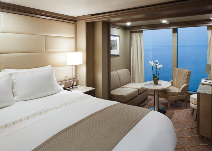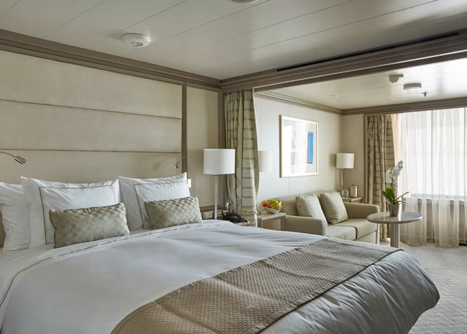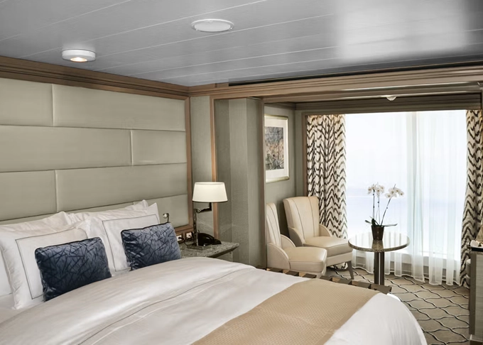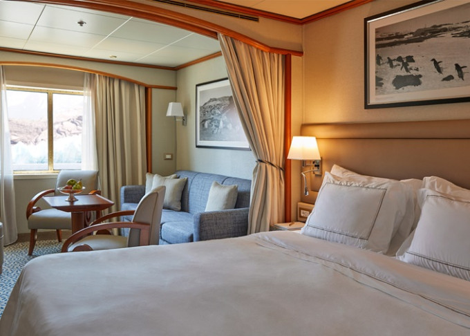 | VI - Vista Suite s oknem 32 m². Panoramatické neotevíratelné okno. 4. paluba. Ložnice s obývací částí. | 365 800 Kč 182 900 Kč za osobu | ||