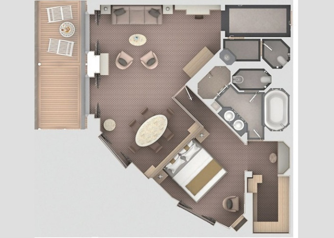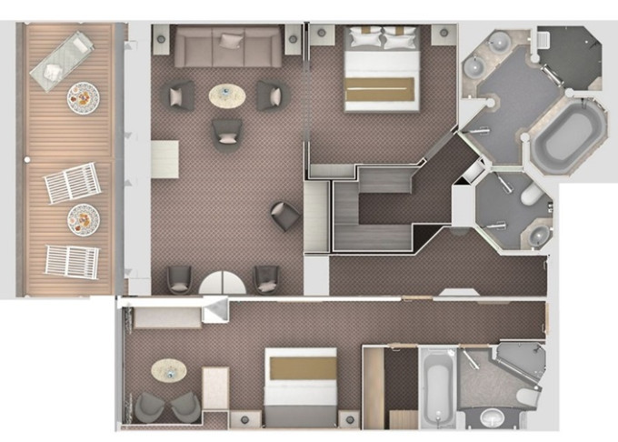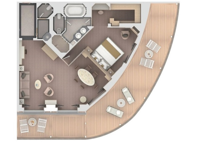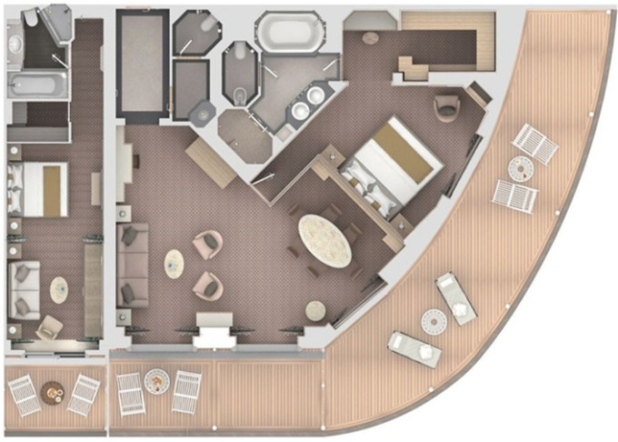 | R1 - Royal Suite 1 105 m² (včetně balkona). Ložnice, oddělená obývací časť. | 947 071 Kč 315 690 Kč za osobu | ||