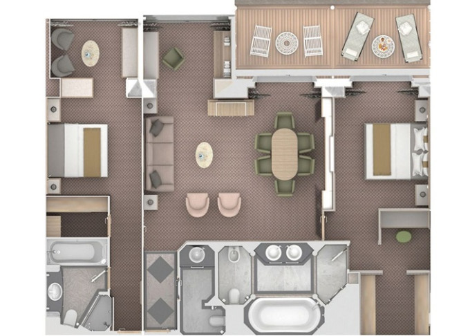 | S2 - Silver Suite 2 104 m² (včetně balkona). 2 ložnice, 2 koupelny, oddělená obývací časť. | 1 270 278 Kč 423 426 Kč za osobu |