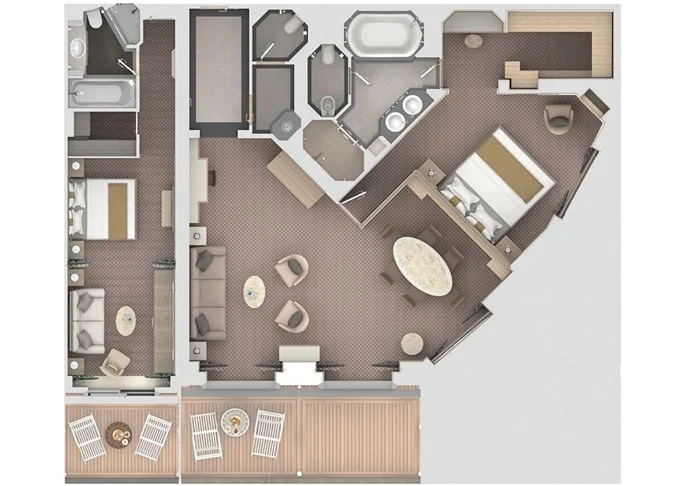 | R2 - Royal Suite 2 142 m² (včetně 2 balkonů). Royal Suite prepojená s Veranda Suite. | 1 122 455 Kč 561 228 Kč za osobu |