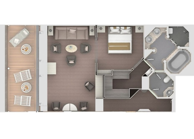 | SV - Superior Veranda Suite 36 m² / balkon 6 m². Vyšší paluby. Ložnice s obývací částí. | 359 536 Kč 359 536 Kč za osobu | ||