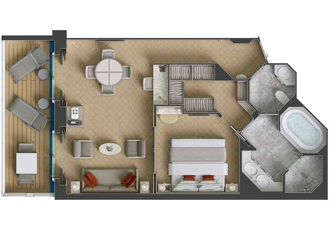 | SV - Superior Veranda Suite 36 m² / balkon 6 m². Vyšší paluby. Ložnice s obývací částí. | 410 899 Kč 205 449 Kč za osobu | ||