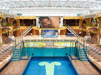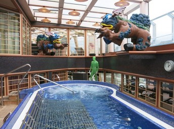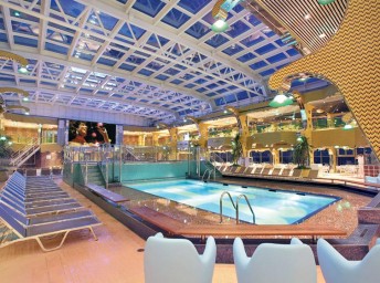 - otevřený bazén na horní palubě, 1 bazén s posuvnou prosklenou střechou, bazén pro děti s vodním miniparkem