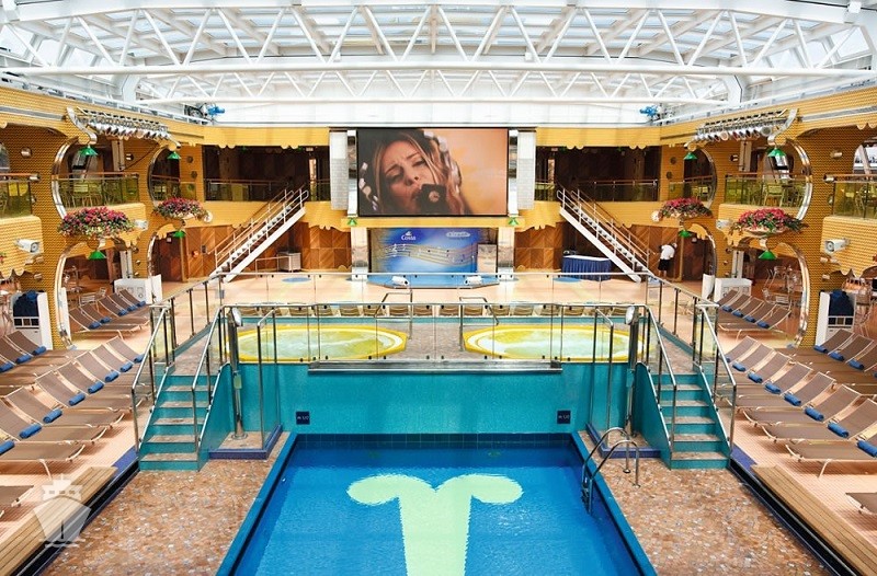 - otevřený bazén na horní palubě, 1 bazén s posuvnou prosklenou střechou, bazén pro děti s vodním miniparkem