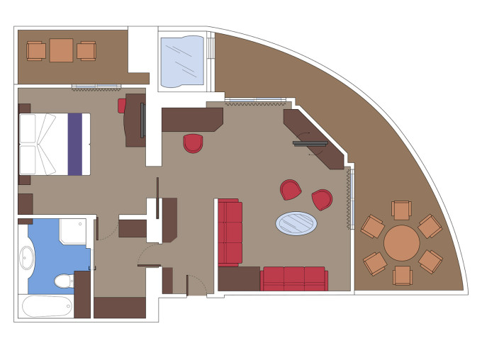 | YC3 - Yacht Club Royal Suite 58 m² + rohový balkon s vířivkou 70 m². Oddělená obývací část a ložnice, šatník, koupelna s vanou a sprchou. 15. paluba. Cenový model MSC Yacht Club. | 749 547 Kč 187 387 Kč za osobu | ||
