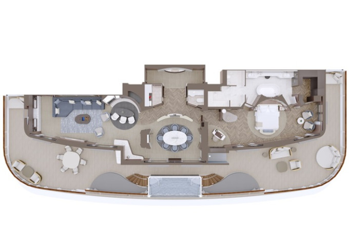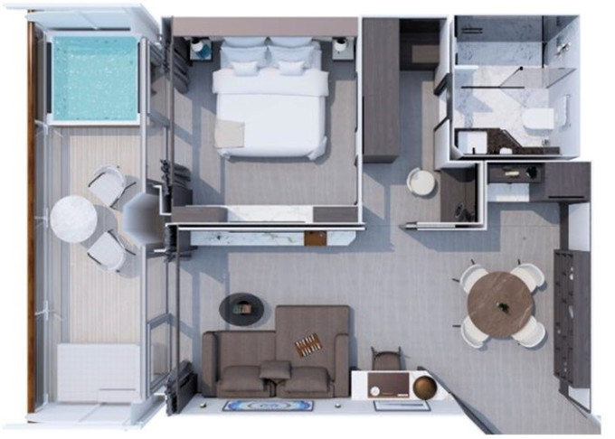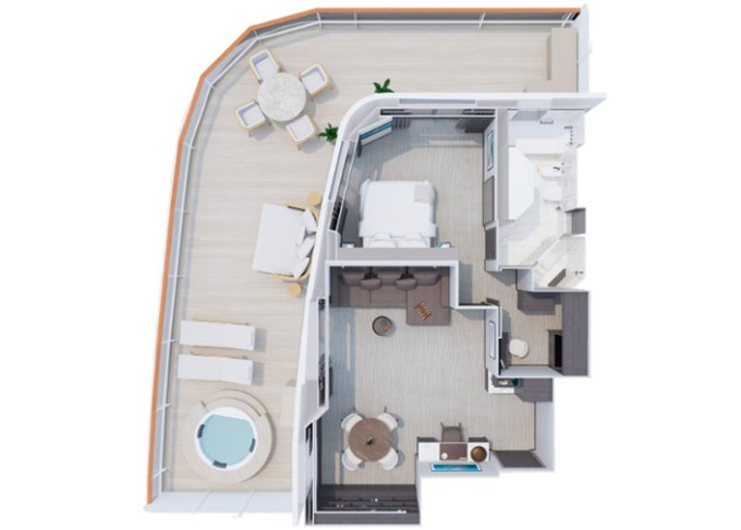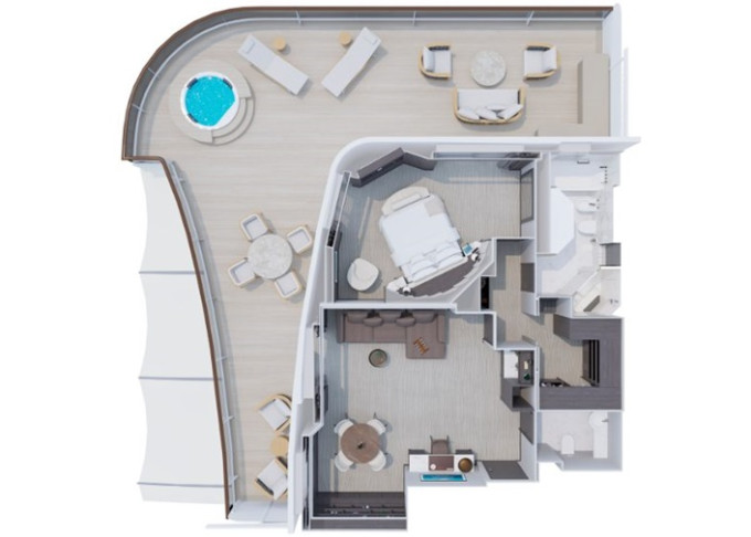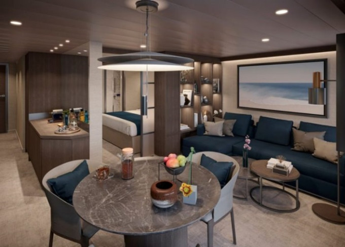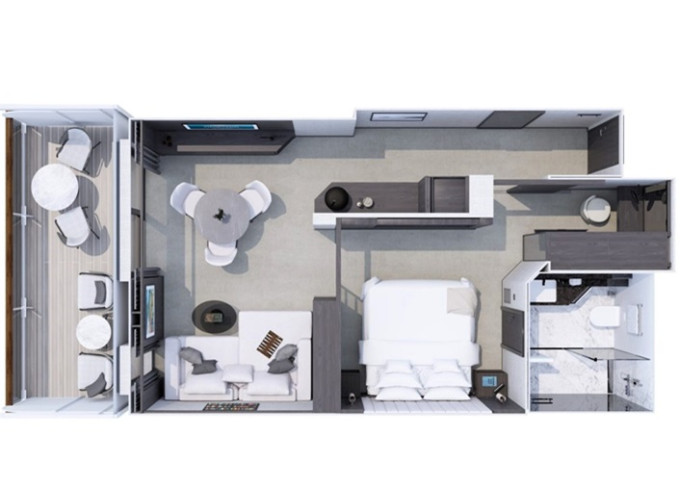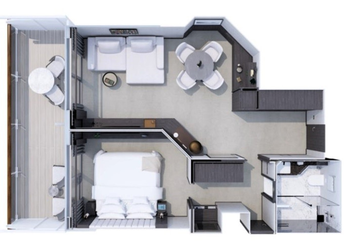 Ubytování na lodi v celkovém počtu 461 apartmá s vlastním balkonem či terasou je rozdělené do 3 základních třích: