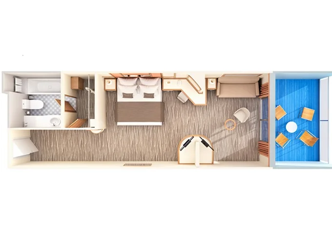 | 8B - Kajuta s balkonem 21,5 - 25,5 m² (včetně balkonu). 10. a 11. paluba. | 74 193 Kč 37 096 Kč za osobu |