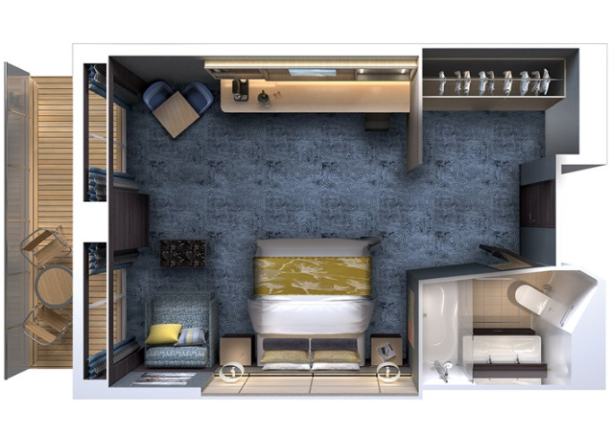 | B1 - Kajuta s balkonem Aft-facing od 20 m² / balkon 4-5 m². 9. až 15. paluba. Max 2-3 osoby. | 73 160 Kč 36 580 Kč za osobu | ||