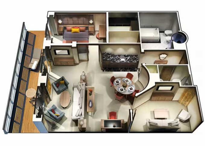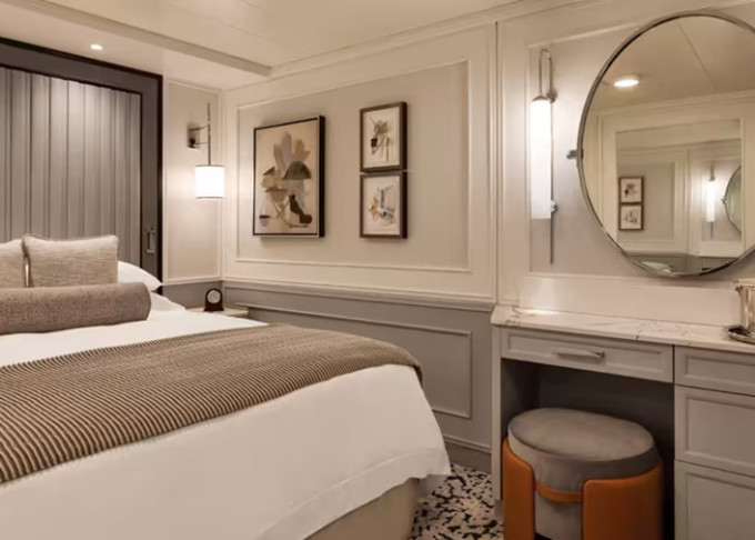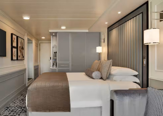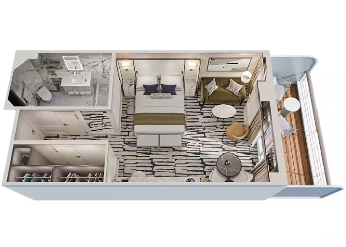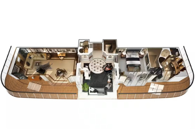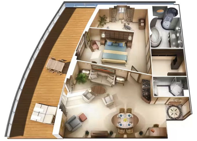 | OS - Owner’s Suite 123 m² + balkon s vířivkou od 62 m². Výhody Owners Suite. 8/9/10. paluba. Max 2-3 osoby. 4 izby: vstupná hala s pianom, ložnice, velká obývací místnost s jídelní částí, 2 koupelny (1 s vířivkou), 2 šatníky. | 1 148 963 Kč 574 482 Kč za osobu | ||
